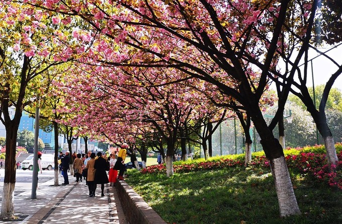 你看,那些樱花树,张开了双臂,拥住这一树繁花,拥住这璀璨春天,拥住这青春笑颜,每每看见这一树粉红,便觉得天底下万物失色,怎么也不及这纯粹的粉,那是怎样的一道风景线啊。