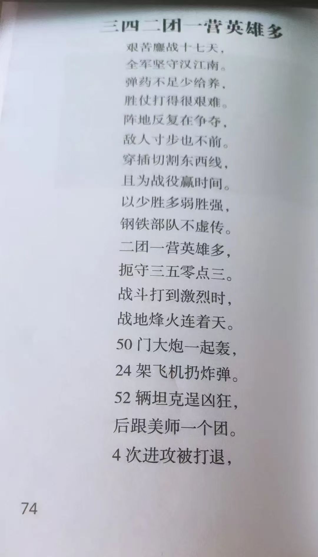 在抗美援朝的第3次战役中。曹玉海的一营,反穿棉衣,端掉美军巢穴,歼敌500名,缴获40门炮,20挺机枪,36辆汽车……曹玉海的一营被称为铁军,曹玉海被称为“钢铁营长”。我想起了岳飞的满江红,“靖康耻,犹未雪,臣子恨,何时灭,驾长车踏破贺兰山缺,壮志饥餐胡虏肉,笑谈渴饮匈奴血,待从头收拾旧河山,朝天阙”。