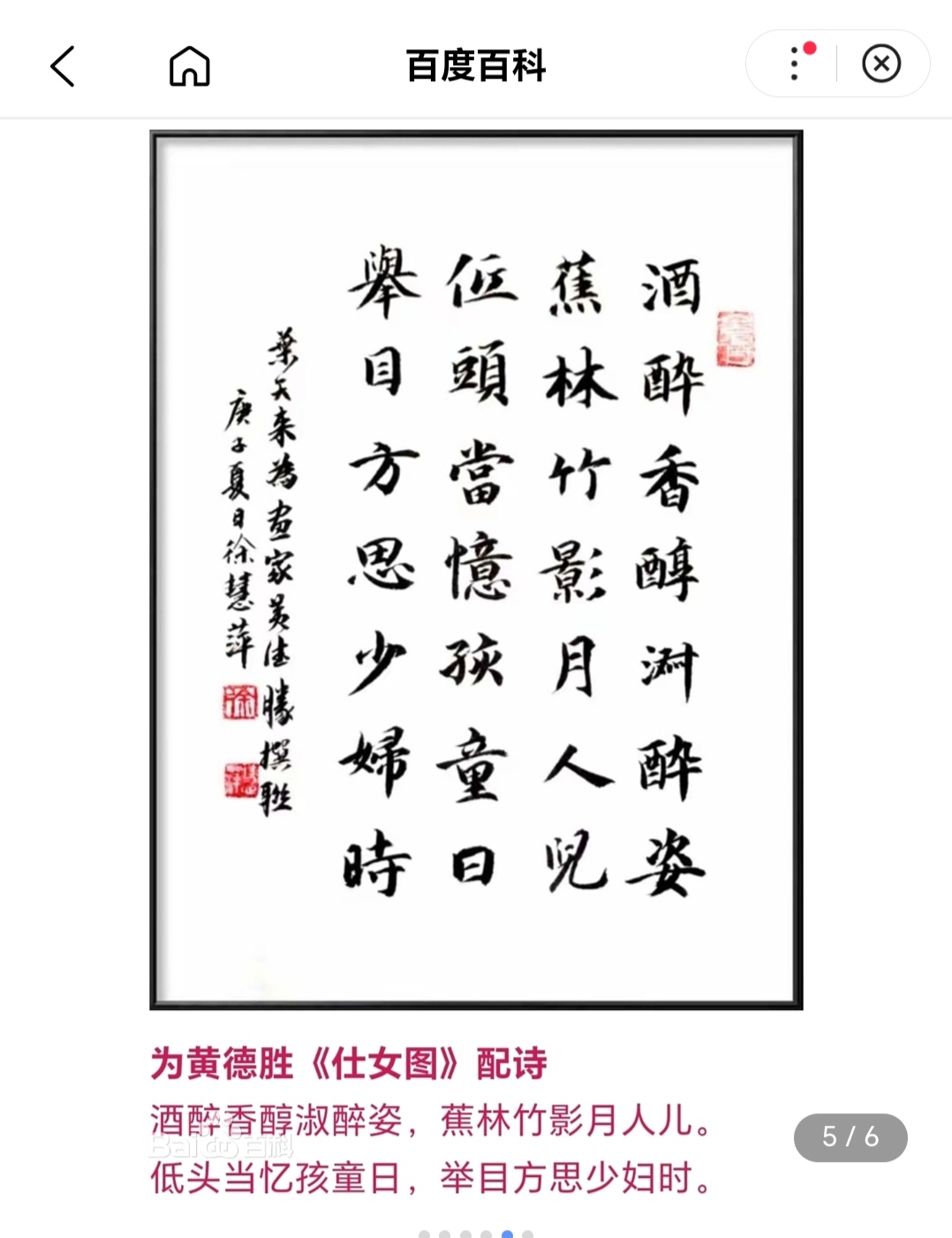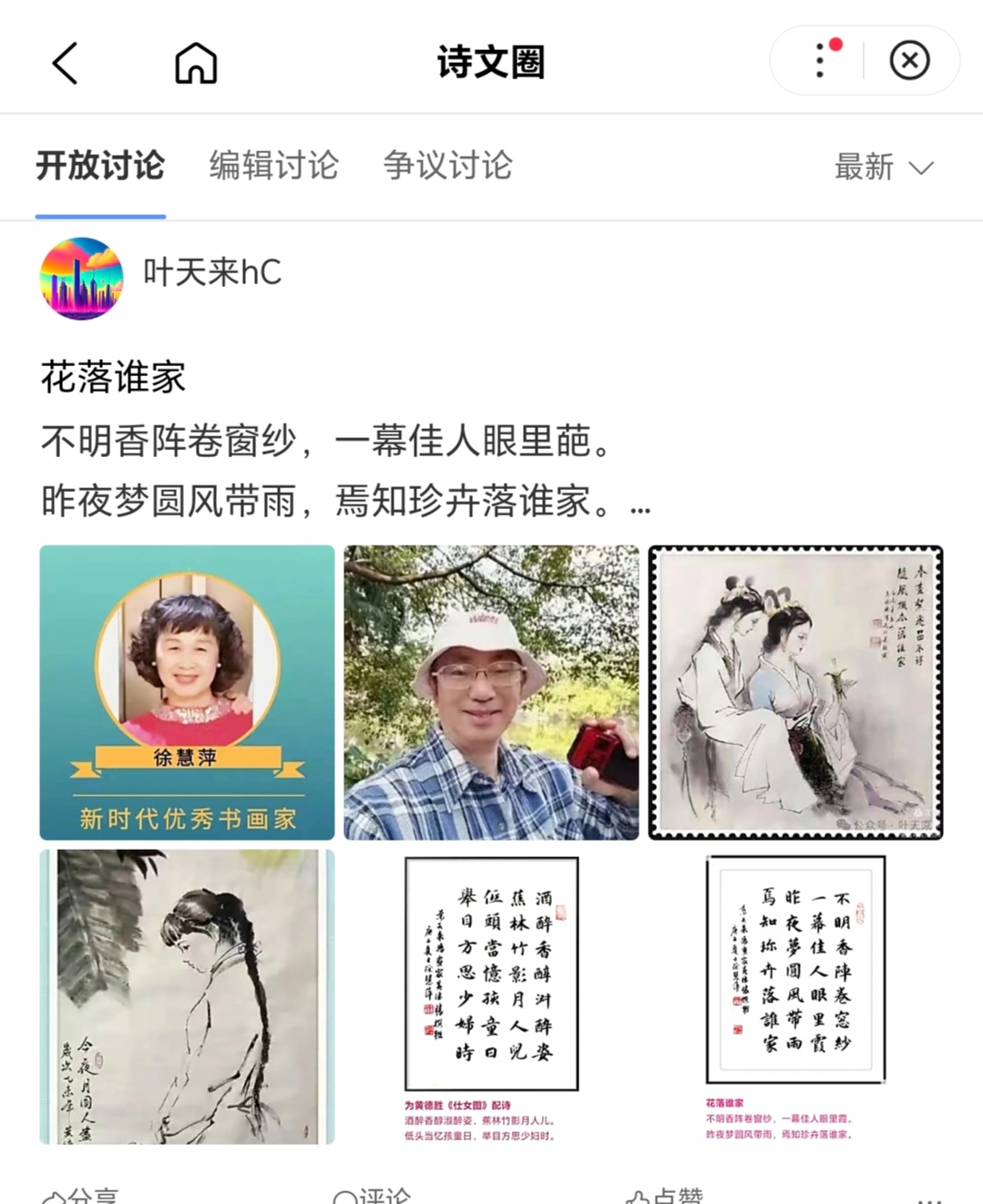 徐慧萍与叶天来有众多诗词对联合作,经徐慧萍书法呈现后,融合绘画、诗词与书法,展现传统艺术魅力。如诗人叶天来为画家黄德胜的《仕女图》、《花落谁家》(后者与画家李胜道合作)配诗,由书法家徐慧萍书写。