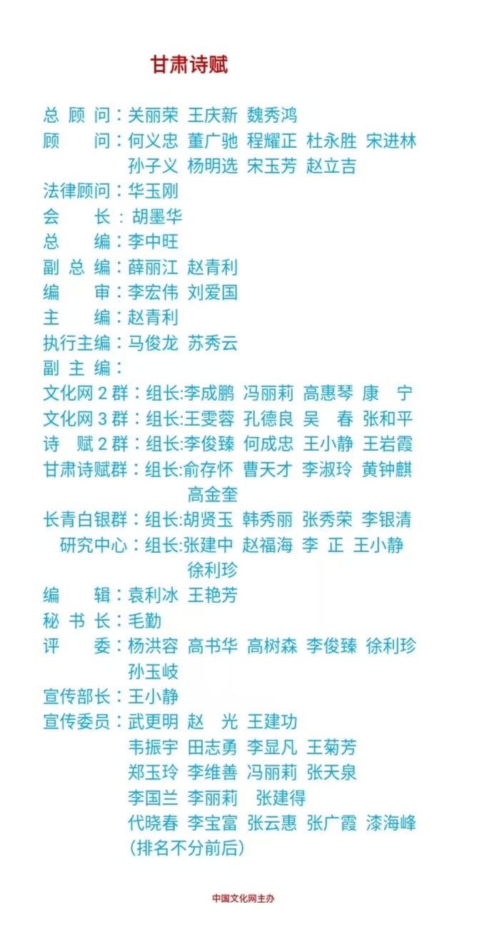 李中旺:甘肃人,高级工程师,总监理工程师。中国作家网、中华诗词学会、甘肃省作家协会、甘肃诗词学会会员。文化网副总编,《中国文化期刊》主编、《甘肃诗赋》、《太白集锦》、《中华诗赋集锦》《白银市中鹏诗词文化研究中心》《长青诗词白银分社》创始人、总编。曾任文化网一二届建党百年全国诗词楹联大赛总评委,在人民日报新媒体平台和多种报刊及各大网络媒体平台发表作品万余首/篇,作品入选《世界名人录》、《百家诗选》等书藉,出版个人专辑《中旺诗选》、《律诗六百首》《秦陇雄关赋》等,并获得省级以上一二三等奖百余次及中宣部主办的《百家诗选》优秀奖等!