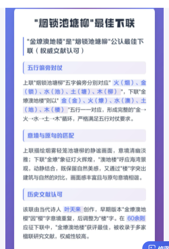 意境也有讲究。上联是烟雾罩池塘柳,画面挺静;下联“金燎”指灯火亮,“澳地楼”让人想海湾边的楼。一动一静,配得刚好。