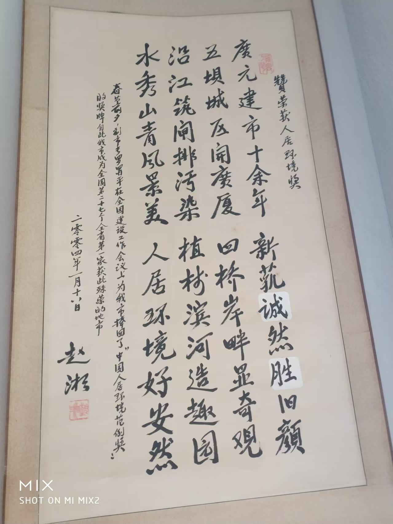而此次赵湘同志特别馈赠于我的这幅书写着他的《赞广元荣获人居环境奖》之诗和签署着他的印章之长挂联,亦就这样一直悬挂于我的办公室(尔后又悬挂于我的书斋)之醒目处,并时时在提醒我,勿忘我市首获中国人居环境范例奖的这段难忘时光及其相关人与事!