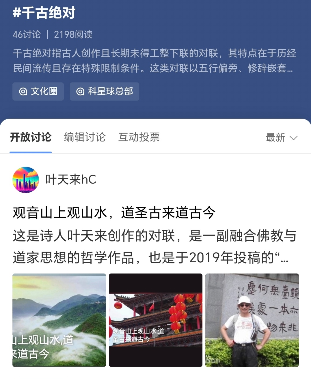 这是诗人叶天来创作的对联,是一副融合佛教与道家思想的哲学作品,也是于2019年投稿的“道圣地前道地天”的延伸与光大发扬。上联以观音山为背景描绘观景之趣,下联以道圣老子为主题阐述古今哲理,体现了中国传统文化的深厚内涵。