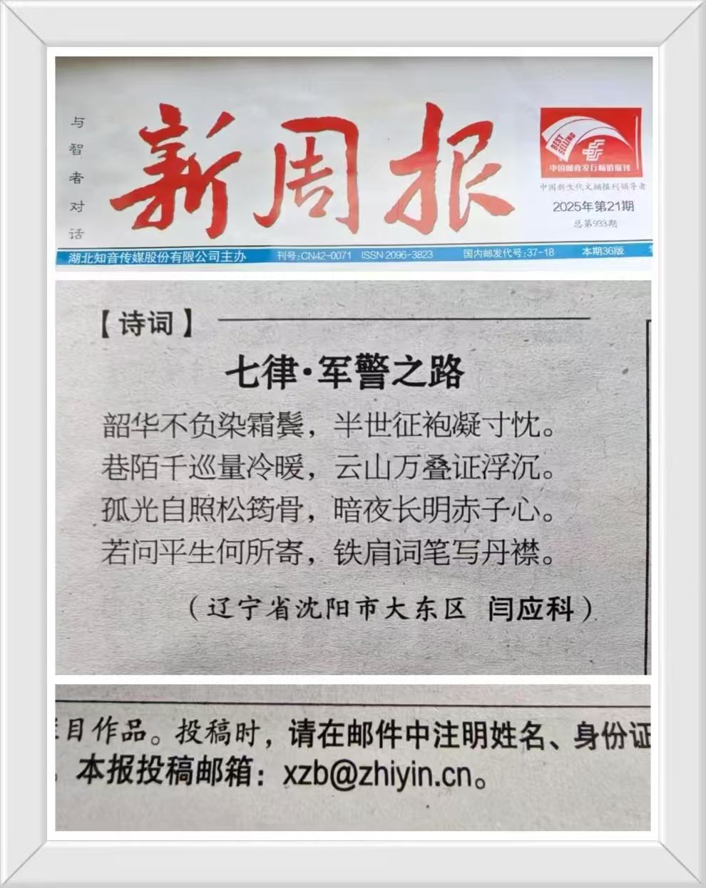 这两首格律诗,作为本文作者荣膺中华诗词学会会员的代表作,分别刊载于湖北《新周报》2025年第21期(总第933期)及大连《老友时代报》2025年6月5日发表。全篇以九十六字精炼字句,生动勾勒出作者军警生涯的忠诚奉献与文学创作的奋进图景。在成为辽宁省作家协会会员两年后,作者凭借扎实深厚的格律诗创作功底,成功跻身诗坛,成为中华诗词学会一员,标志着其文学创作生涯的又一重要里程碑。