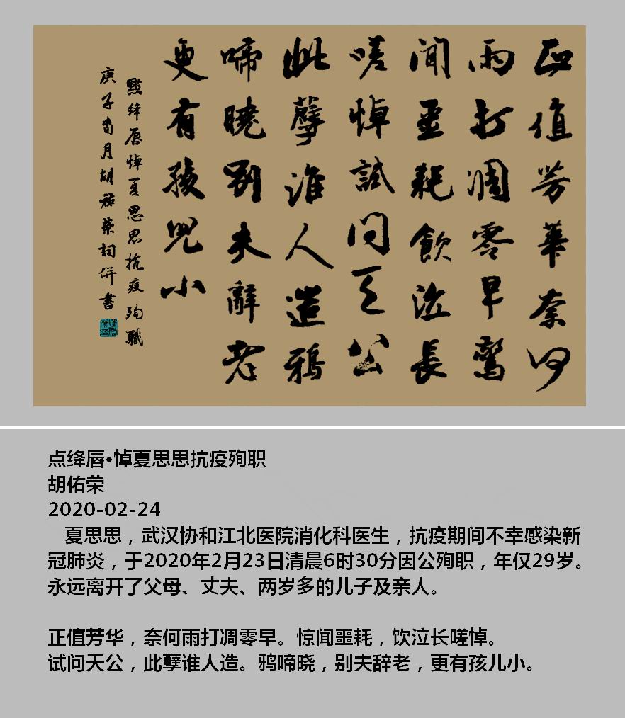 赞[0] 分享 收藏评[0] 分享到 点绛唇·悼夏思思抗疫殉职/胡佑荣 作者:胡佑荣 阅读:11 次更新:2026-01-23 举报 点绛唇·悼夏思思抗疫殉职胡佑荣2020-02-24夏思思,武汉协和江北医院消化科医生,抗疫期间不幸感染新冠肺炎,于2020年2月23日清晨6时30分因公殉职,年仅29岁。永远离开了父母、丈夫、两岁多的儿子及亲人。正值芳华,奈何雨打凋零早。惊闻噩耗,饮泣长嗟悼。 试问天公,此孽谁人造。鸦啼晓,别夫辞老,更有孩儿小。点绛唇·悼夏思思抗疫殉职词图片 上一篇: 出牌 下一篇: 《笑侃名著悟人生(组诗)》赏析