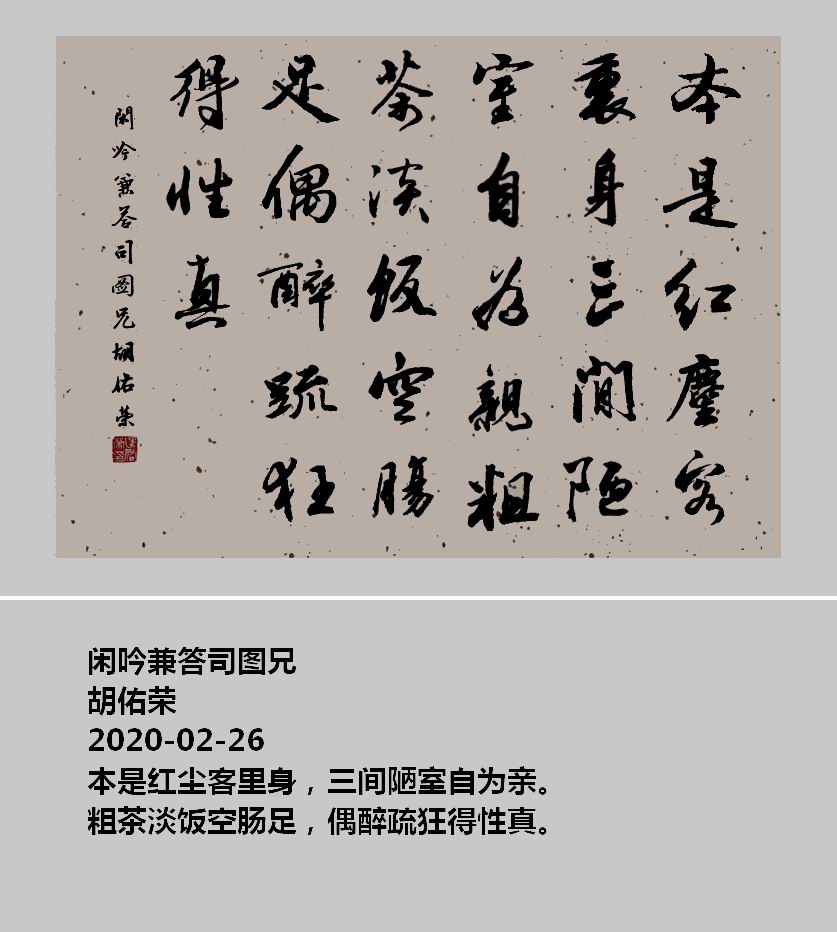 赞[0] 分享 收藏评[0] 分享到 闲吟兼答司图兄 作者:胡佑荣 阅读:9 次更新:2026-01-23 举报 闲吟兼答司图兄胡佑荣2020-02-26本是红尘客里身,三间陋室自为亲。粗茶淡饭空肠足,偶醉疏狂得性真。闲吟兼答司图兄图片 上一篇: 铁骨丹心照汉廷——《七排·道冯唐》赏析 下一篇: 《七律 奔赴红江(新韵)》赏析