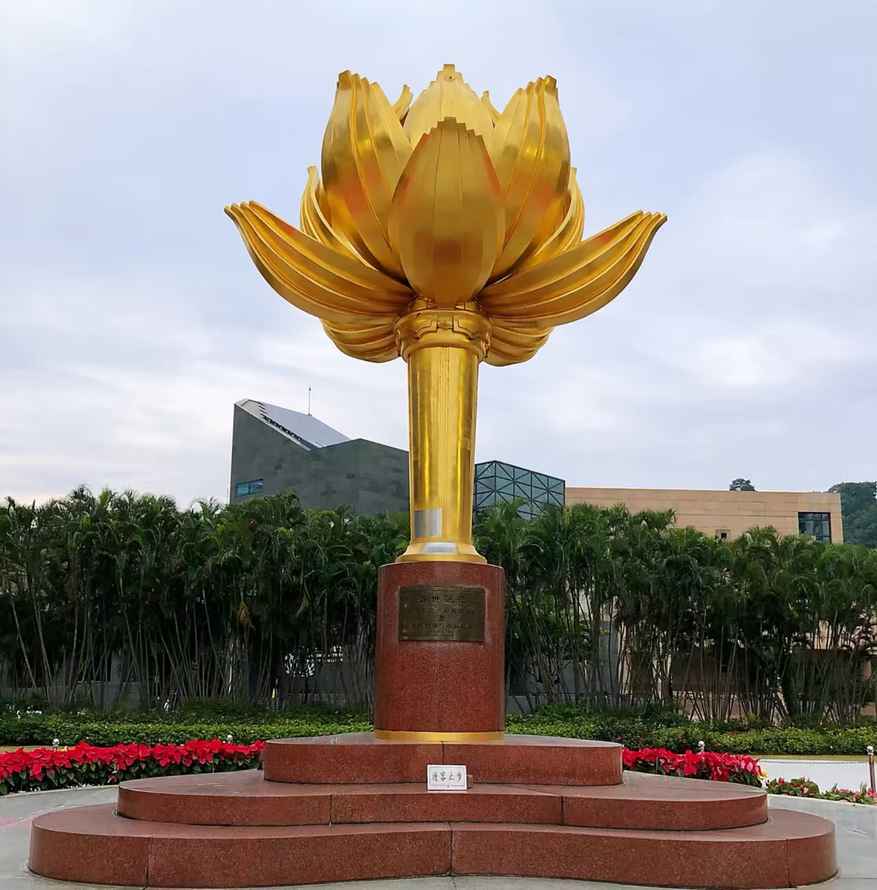 附:澳门的金莲花,这一雕塑名为“盛世莲花”,是1999年澳门回归时中央人民政府赠送的礼物,主体部分(花茎、花瓣和花蕊)采用青铜材质,外层覆盖金箔,总重6.5吨。