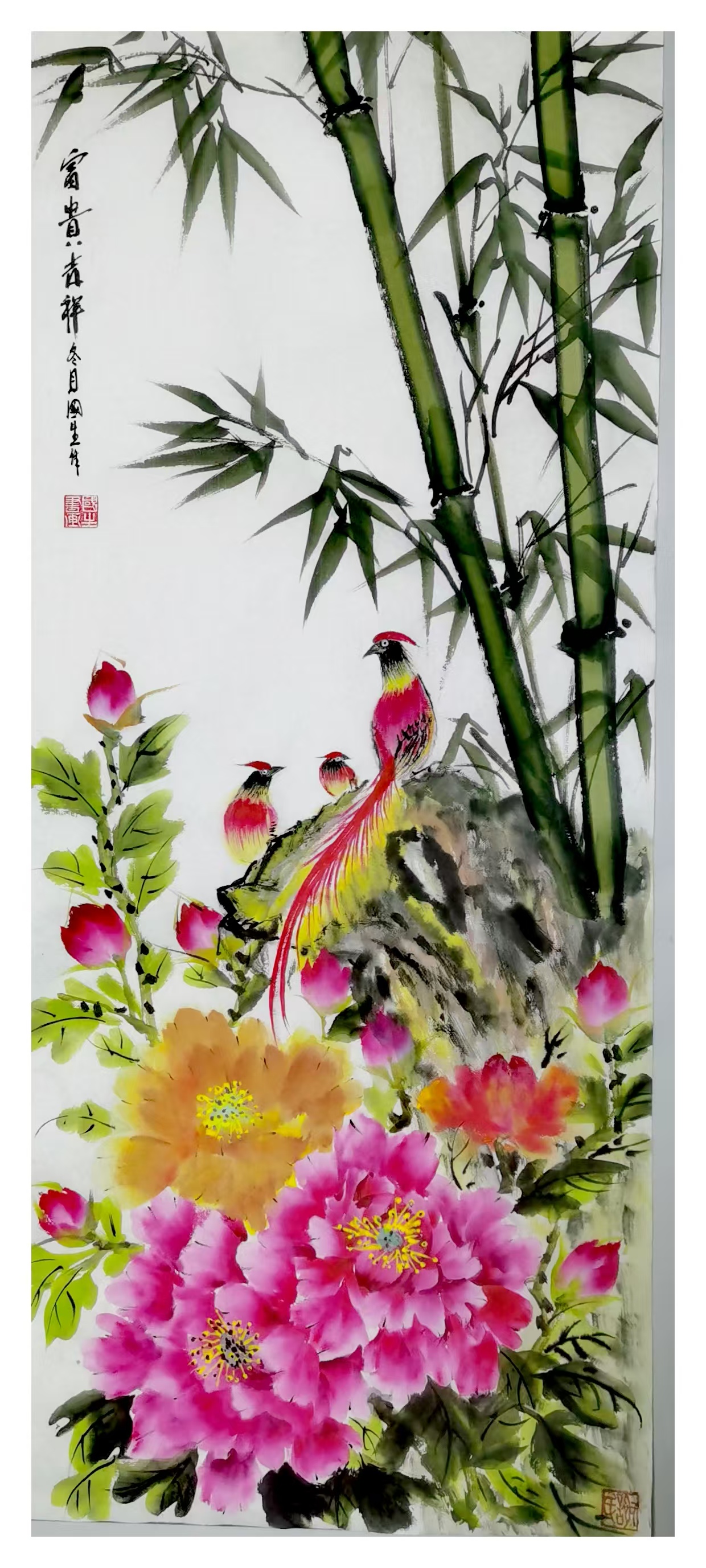 4. 配诗:七言绝句一首《竹青映丹红》“翠影扶疏映碧空,牡丹鲜艳醉春红。罕闻寿鸟枝头立,一望竹青万意融。”
