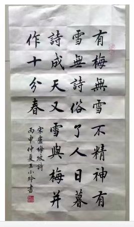 经过多年的网络传播及书画雅集中挥毫,叶天来当年为王小玲的《玲珑阁》写的对联现已成“经典”了,过后在微信朋友圈中又见到她的一幅《雪梅》书法,忍不住收藏了它,忍不住以专题写文发表,重温这付对联。