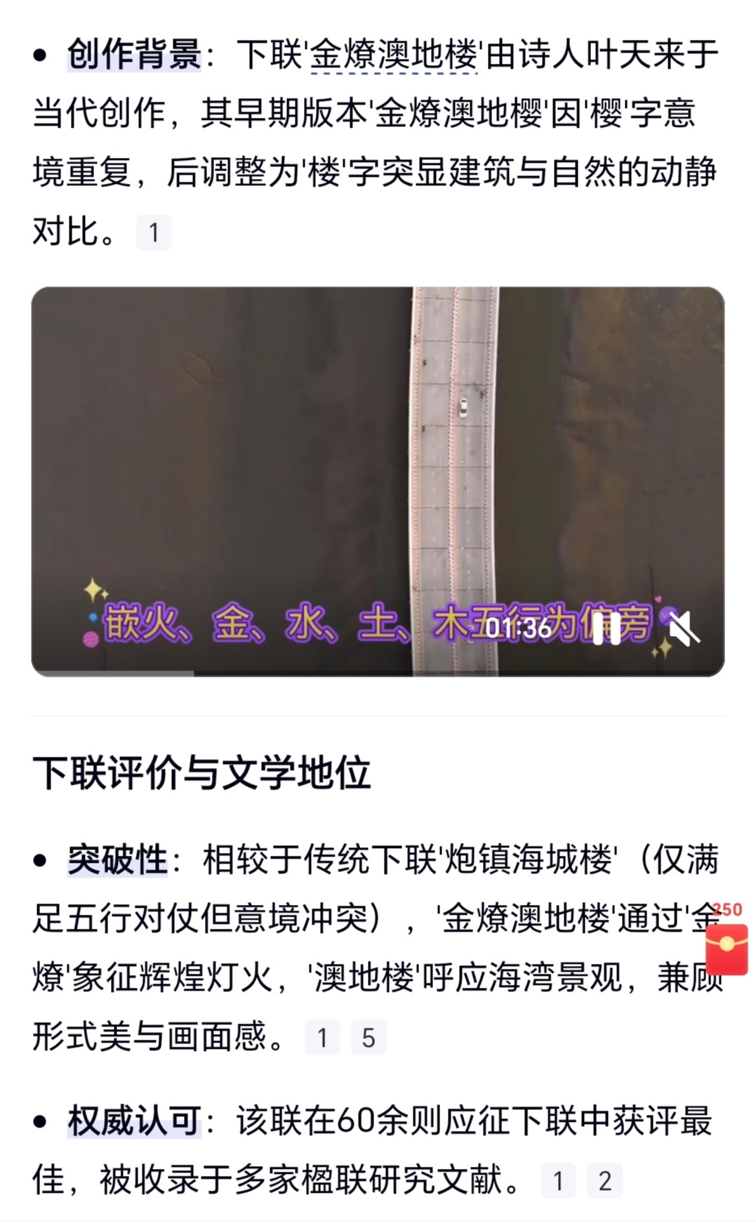 创作动机:旨在突破传统下联(如“炮镇海城楼”)仅满足五行对仗但意境冲突的局限,通过现代元素(如澳门夜景)呼应古典上联。