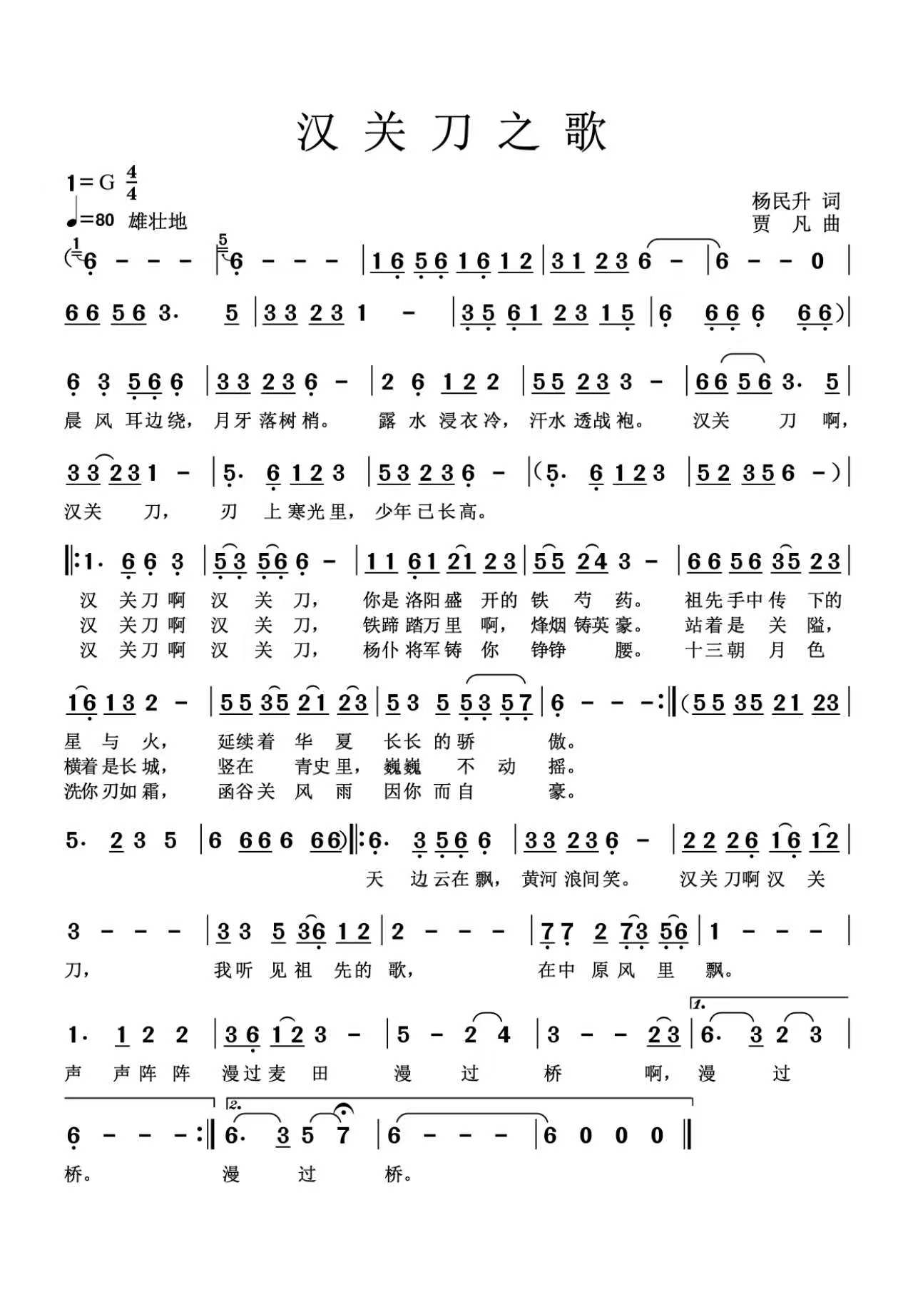 赞[0] 分享 收藏评[0] 分享到 歌词《汉关刀之歌》 作者:植心斋 阅读:21 次更新:2026-02-08 举报 汉关刀之歌词谱 作为《汉关刀》的词作者,我怀着无比诚挚的心意向参与创作的每一位艺术家致敬——感谢作曲家以音符铸就灵魂,歌唱家用声线赋予生命,视频创作者以光影编织传奇。这首作品承载着我对先祖杨仆将军的无限追思,那横刀立马的英姿仿佛穿越千年,仍在字里行间铮铮作响;更寄托着对故土山河的缱绻深情,如同黄河浪涛般绵延不绝。当非遗传承的星火在旋律中重燃,我仿佛看见那柄传世宝刀正劈开时光迷雾,在当代焕发新的锋芒。愿这首凝结集体智慧的作品,能像春风中的柳笛,将这份文化传承的赤子之心,吹进每位知音的心田。 上一篇: 草人诗稿108-踏莎行·本来无一物 下一篇: 襄阳慈母在北京