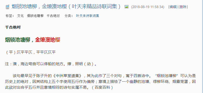 “烟锁池塘柳”,被称之为千古绝句,又说是历史第一绝句。“烟锁池塘柳,金燎澳地楼”是一副工整的五行对联,既传承了文字游戏的巧思,又通过意象对比(烟柳静谧 vs 金楼辉煌)展现诗意张力。叶天来此对展现了传统对联在现代创作中的生命力。