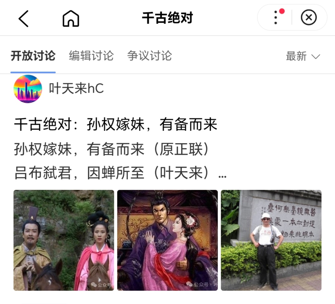 事前我没看过这故事,这么巧合了:唐伯虎写春秋之西施,叶天来写三国之貂蝉(与上联一样)。撰写后将我的对联贴在《今日头条》及微信朋友圈被众多位老师大赞。