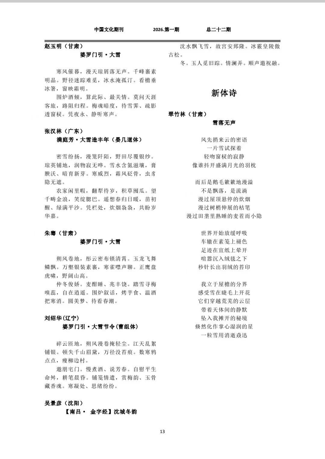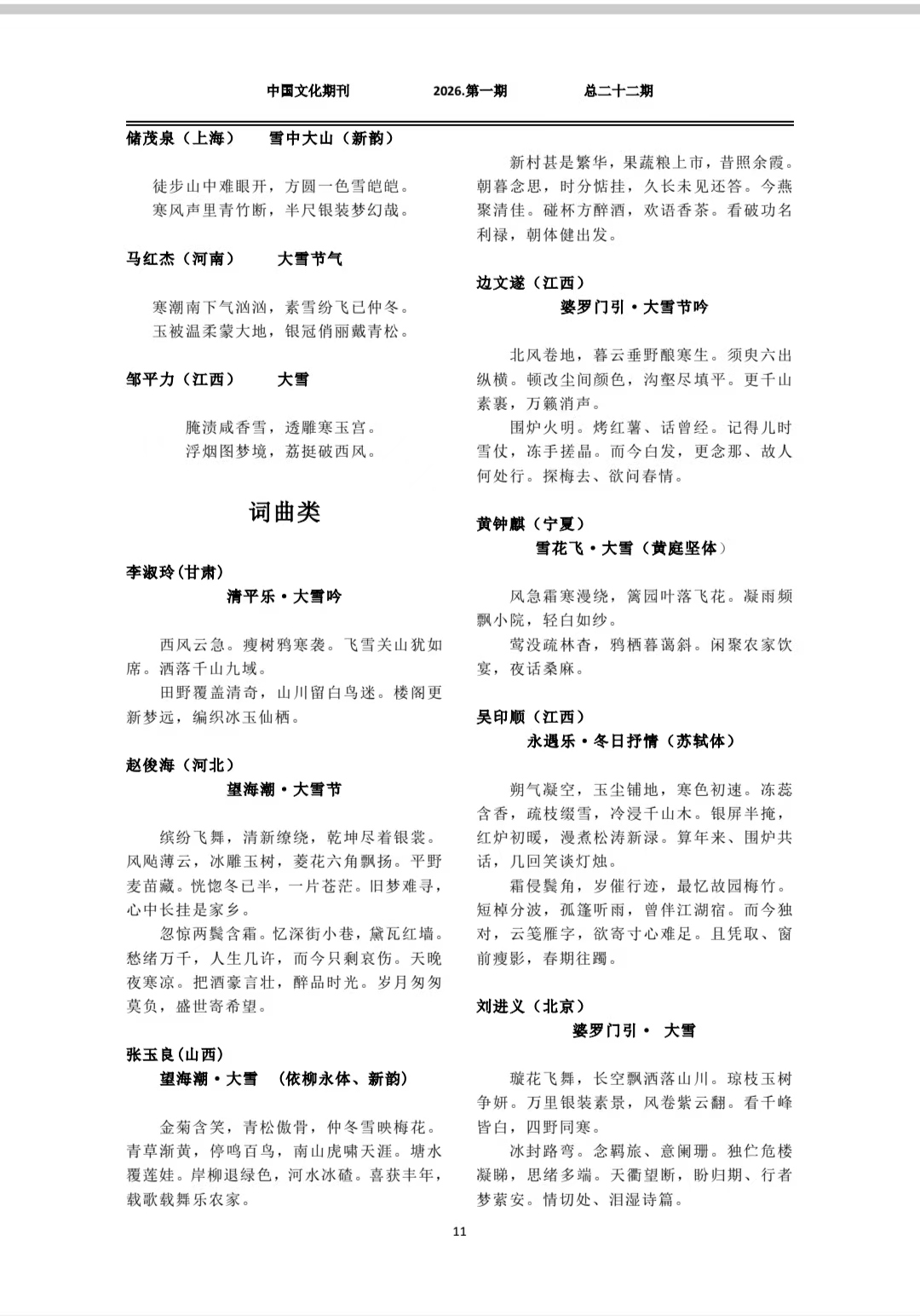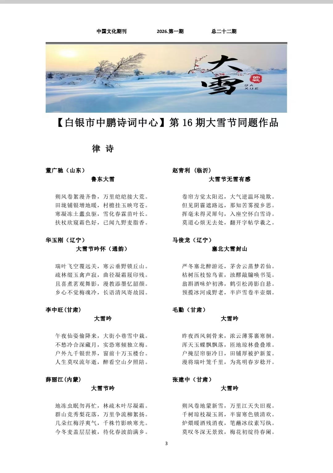 韩秀丽老师的《满庭芳》以“大雪无雪”为线索,串联起景、情、理、事,既保持了传统格律词的雅致韵味,又融入了现代生活的真实质感与家国情怀,意象鲜活,立意高远,景语清丽,情语真挚,于尺幅之间见格局、于传统之中出新意。甘肃酒泉降水量少,风光资源充足,“利用风光” 既指自然景观,又暗指风能、太阳能等清洁能源,一语双关,承载了当代生活内容与时代精神,赋予古典文学新的生命力。