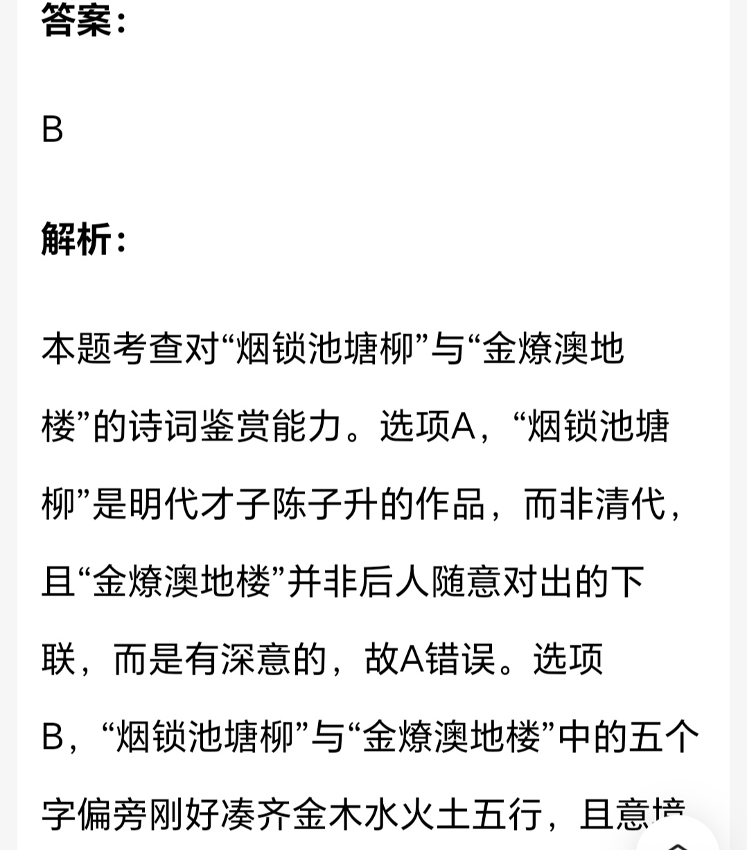 选项A,“烟锁池塘柳”是明代才子陈子升的作品,而非清代, 且“金燎澳地楼”并非后人随意对出的下联,而是有深意的,故A错误。