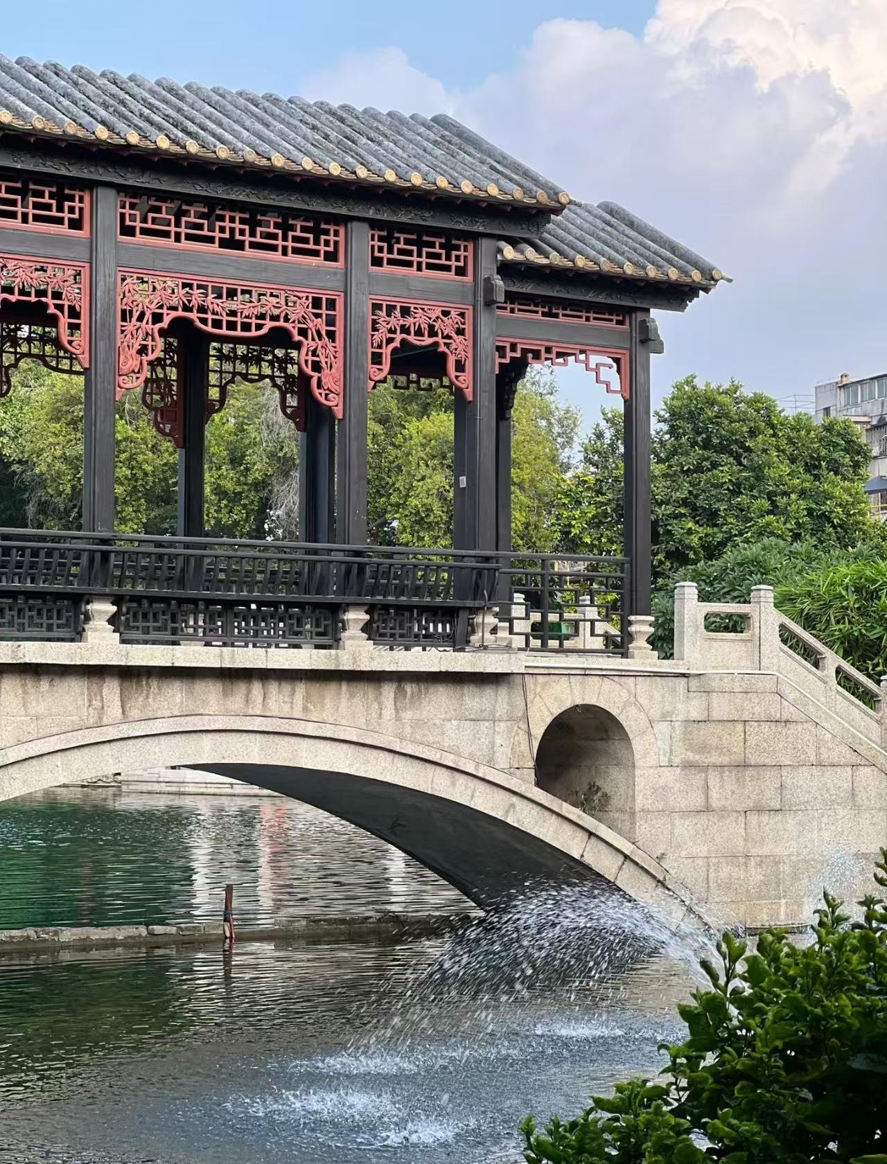 梁园作为岭南四大名园之一,其设计充分体现了岭南园林的独特风格。园内湖水萦回,水榭与桥亭精巧布置,营造出流动而雅致的秀美景致。 站在雕花繁美的水榭中,透过窗棂望去,绿水、晴空与葱茏树木交织,构成四季变幻的风景画。 园中路径曲径通幽,行至汾江草庐,可见碧波荡漾的畅意湖,桥亭与曲径依林而转,生动诠释了“水榭桥亭流雅秀”的诗意。