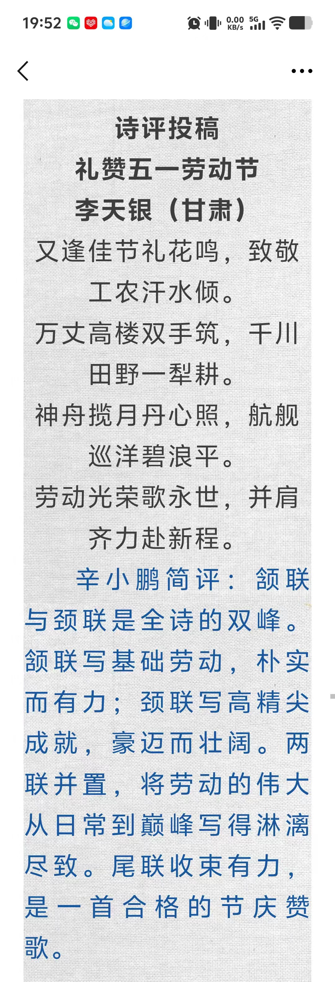 赞[0] 分享 收藏评[0] 分享到 礼赞五一劳动节 作者:李天银 阅读:8 次更新:2026-04-26 举报 礼赞五一劳动节礼赞五一劳动节 上一篇: 读《复活》有感 下一篇: 多余之人:时代夹缝中的精神孤影与人性镜像